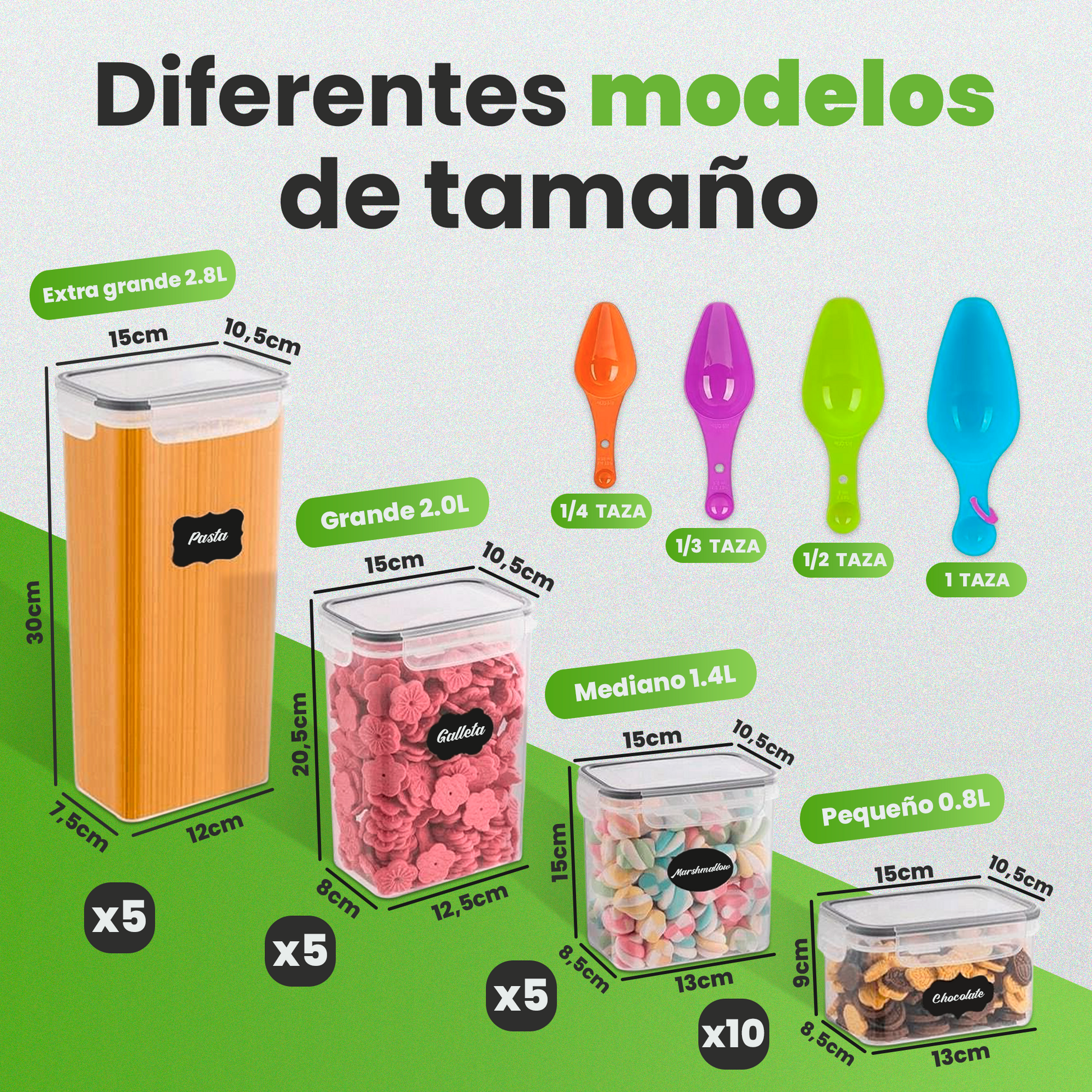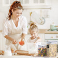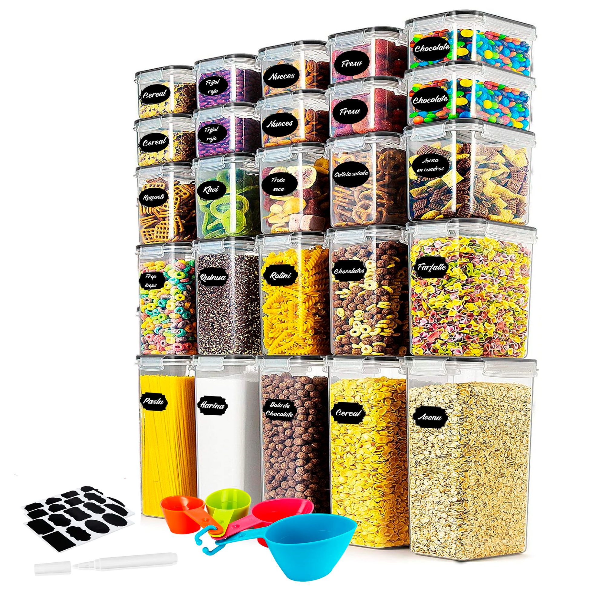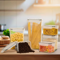 Diseño hermético y multifuncional: Equipadas con tiras de sellado de silicona y cerraduras medidoras, estas cajas aseguran que tus alimentos se mantengan frescos y protegidos del aire y la humedad. Además, son ideales para almacenar una amplia gama de alimentos, desde cereales y harina hasta fideos y café.