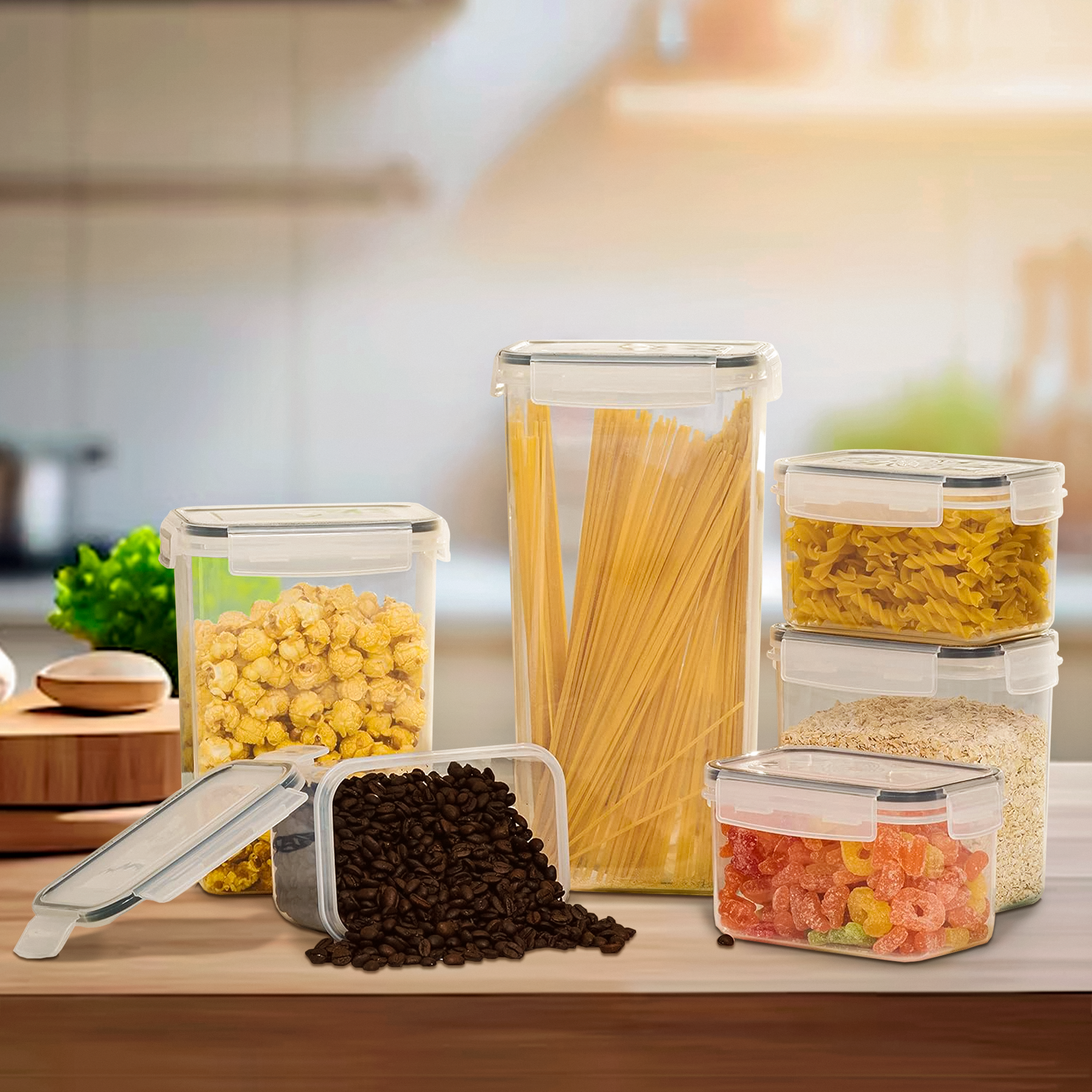Variedad de tamaños y capacidades: Este juego incluye 8 cajas de almacenamiento de cocina en diferentes tamaños y capacidades, desde 0,8 L hasta 2,8 L, para satisfacer tus diversas necesidades de almacenamiento de alimentos.